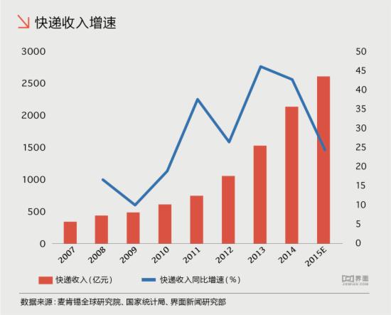 但是大多數(shù)人只看到了網(wǎng)購以及快遞行業(yè)的朝氣蓬勃,卻忽略了近5年的高速發(fā)展帶來的行業(yè)瓶頸問題。上圖顯示,在快速增長的背后卻是2014年以來的增速快速下滑。2015年度快遞行業(yè)收入增速從2014年的40%快速下滑至2015年度的24%,其主要的原因是網(wǎng)購熱情的冷卻。已經(jīng)舉辦了7年的淘寶雙十一儼然成為線上線下商家買家狂歡的盛宴,但近兩年也因貨品質(zhì)量、快遞后遺癥以及營銷手段等倍受詬病。冰凍三尺非一日之寒,網(wǎng)購的諸多問題反應(yīng)在快遞行業(yè)上也是一系列數(shù)據(jù)的下滑。