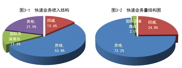 1月,同城、異地、國(guó)際及港澳臺(tái)快遞業(yè)務(wù)收入分別占全部快遞收入的13.6%、53.8%和11.6%;業(yè)務(wù)量分別占全部快遞業(yè)務(wù)量的24.8%、73.2%和2.0%。與去年同期相比,同城快遞業(yè)務(wù)收入的比重上升0.2個(gè)百分點(diǎn),異地快遞業(yè)務(wù)收入的比重下降2.9個(gè)百分點(diǎn),國(guó)際及港澳臺(tái)業(yè)務(wù)收入的比重下降了2個(gè)百分點(diǎn)。