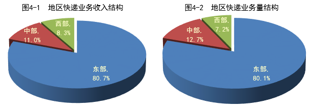 1月,東、中、西部地區(qū)快遞業(yè)務(wù)收入的比重分別為80.7%、11%和8.3%,業(yè)務(wù)量比重分別為80.1%、12.7%和7.2%。與去年同期相比,東部地區(qū)快遞業(yè)務(wù)收入比重下降了1.1個(gè)百分點(diǎn),快遞業(yè)務(wù)量比重下降了1.6個(gè)百分點(diǎn);中部地區(qū)快遞業(yè)務(wù)收入比重上升了0.9個(gè)百分點(diǎn),快遞業(yè)務(wù)量比重上升了1.4個(gè)百分點(diǎn);西部地區(qū)快遞業(yè)務(wù)收入比重上升了0.2個(gè)百分點(diǎn),快遞業(yè)務(wù)量比重上升了0.2個(gè)百分點(diǎn)。