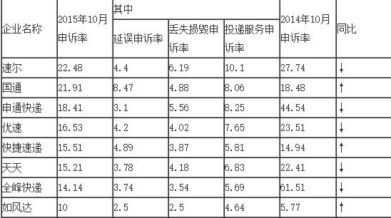 速爾、國通、申通三家占據(jù)投訴榜前三,其中,國通延誤率是所有快遞公司中最高的,而申通的丟失損毀投訴率和投遞服務(wù)申訴率也雙雙“高居”全國第二,僅次于速爾。