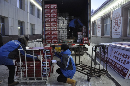 查干湖冬捕,即查干湖冬季冰雪漁獵,是一種極其傳統(tǒng)的漁業(yè)生產(chǎn)方式,始于史前、盛于遼金,延續(xù)至今千年未變,當(dāng)?shù)貪O民被稱為“最后的漁獵部落”。12月末到春節(jié)前是查干湖冬捕的黃金時(shí)間,漁民借助馬拉絞盤的力量在冰下行網(wǎng)捕魚,其盛大的場景每年都吸引著數(shù)萬國內(nèi)外游客前來觀看。2011年,中通吉林松原公司開通了查干湖承包區(qū),推出了“大美查干湖、中通鮮到家”的宣傳口號,并自行購置加厚紙箱、保溫箱等專業(yè)包裝材料,為寄遞客戶提供免費(fèi)包裝服務(wù)。如今,查干湖分部承包區(qū)日發(fā)件量500票以上,名列松原公司首位,也為查干湖魚的對外銷售打開了一條新通道。